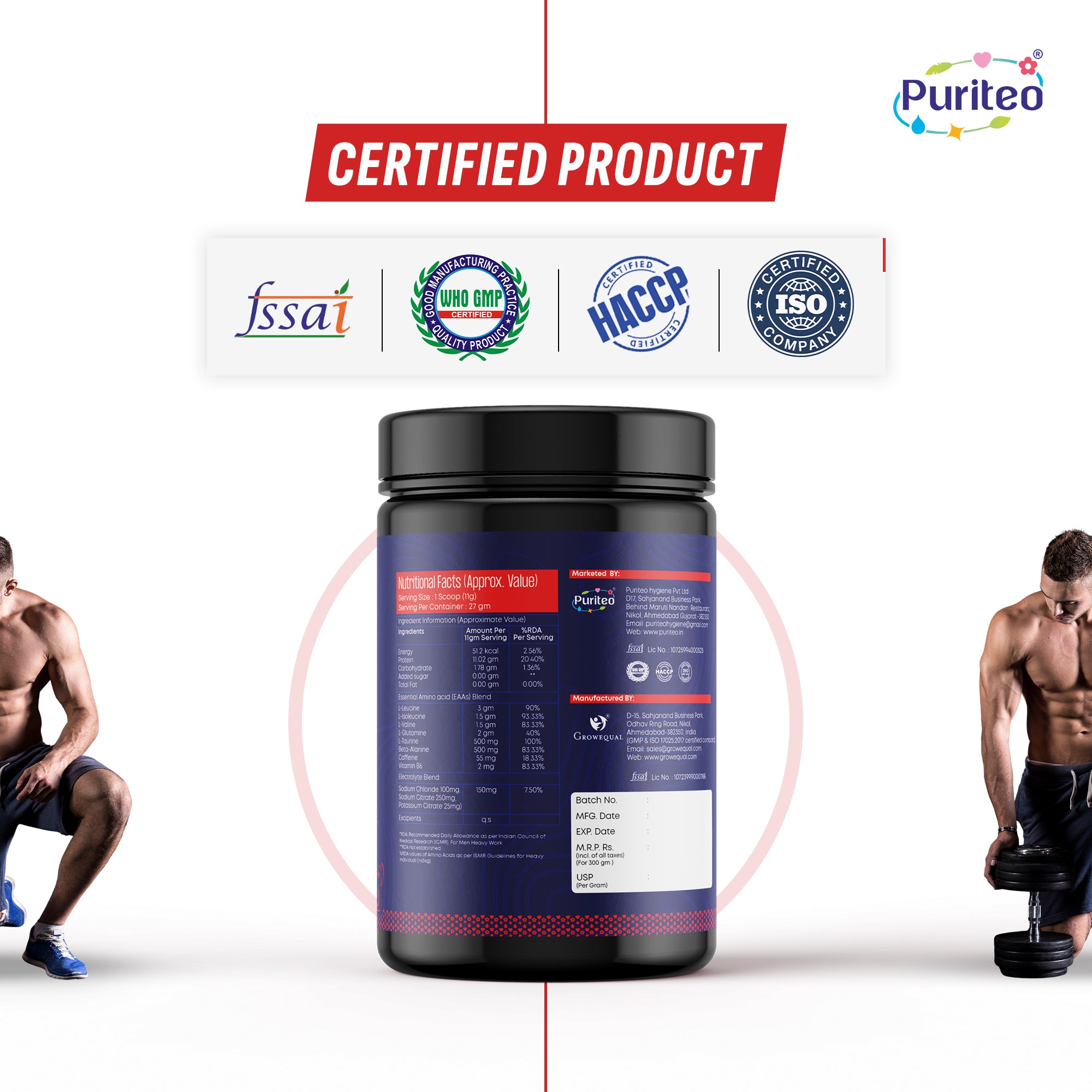 Puriteo BCAA is formulated with the optimal 2:1:1 ratio of Leucine, Isoleucine, and Valine to support muscle growth, repair, and endurance. It replenishes amino acids lost during intense workouts, reduces muscle soreness, and prevents fatigue, helping you recover faster and train harder. Whether it’s pre, intra, or post-workout, this refreshing blend keeps your muscles fueled, hydrated, and ready for the next challenge — without any added sugar or fillers.