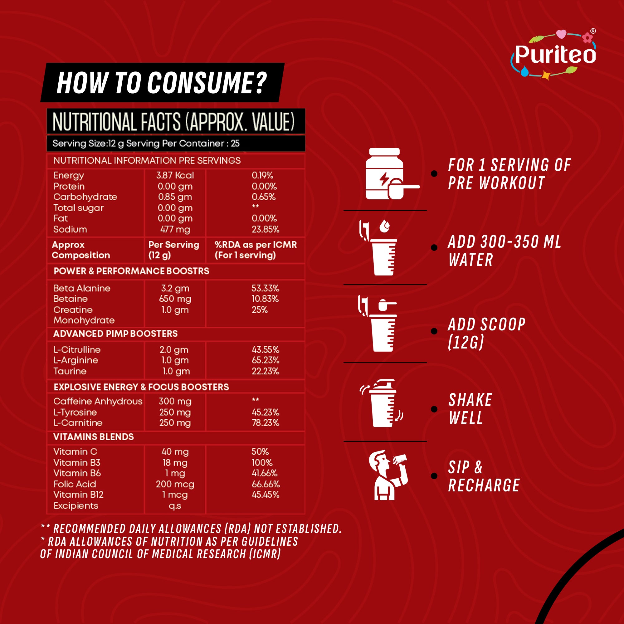 Ignite your workout with Puriteo Pre-Workout Powder — a powerful blend of clean energy, focus, and endurance-boosting ingredients. Designed to push limits, sharpen focus, and fuel performance from the first rep to the last.